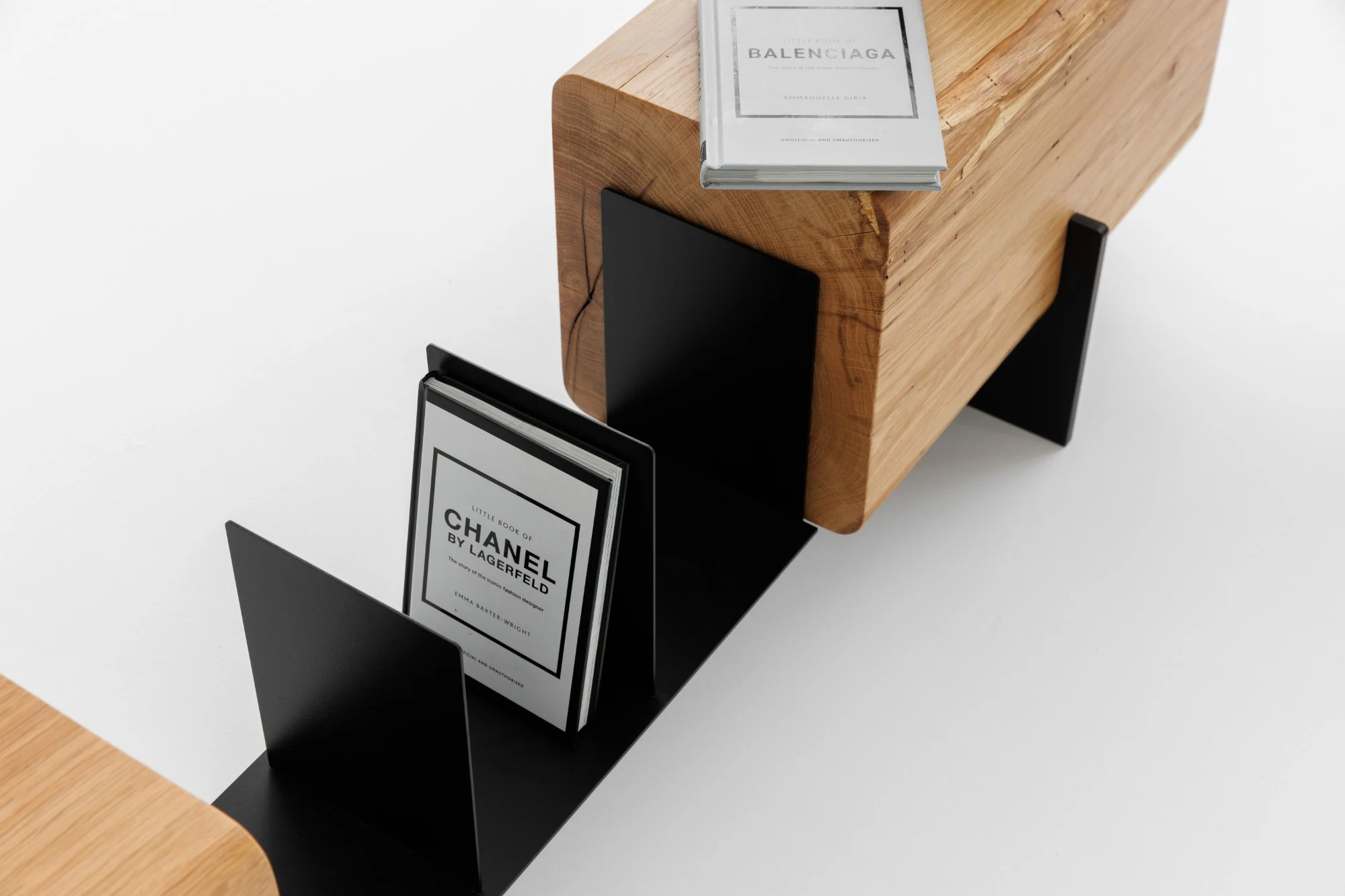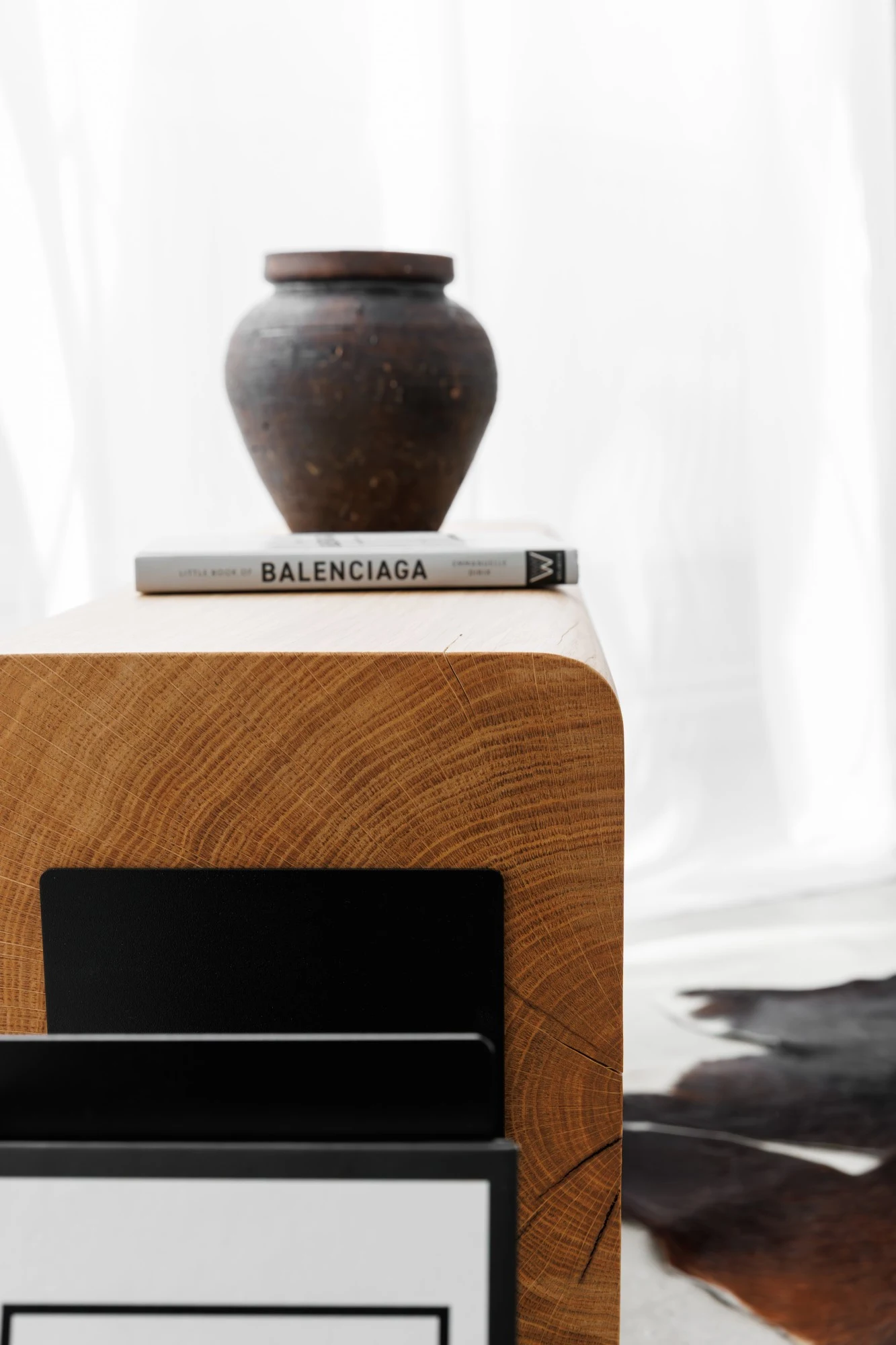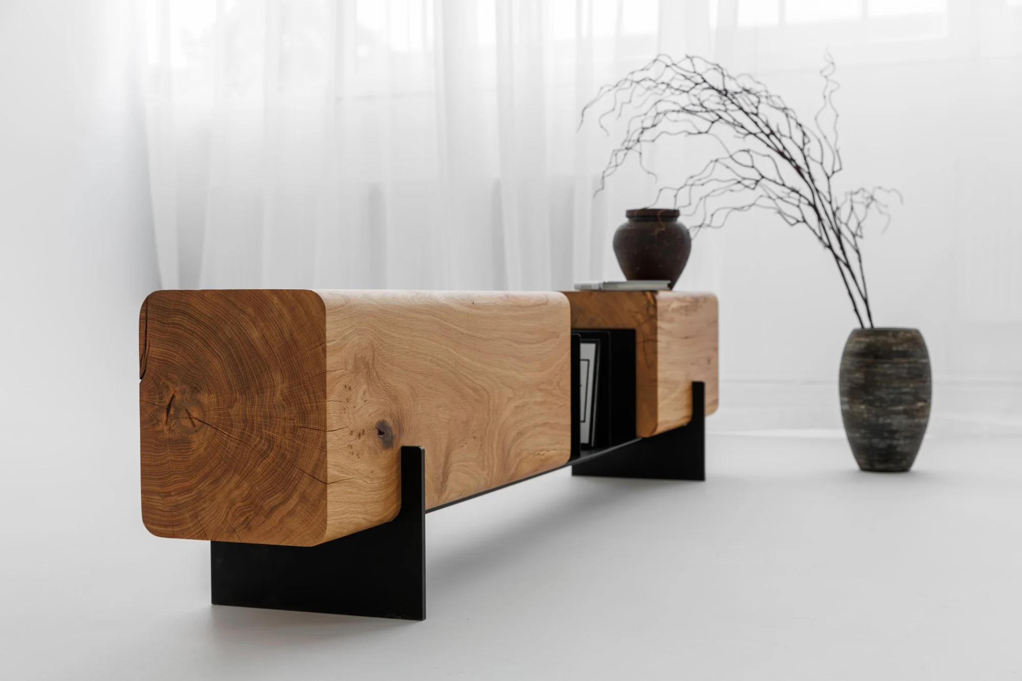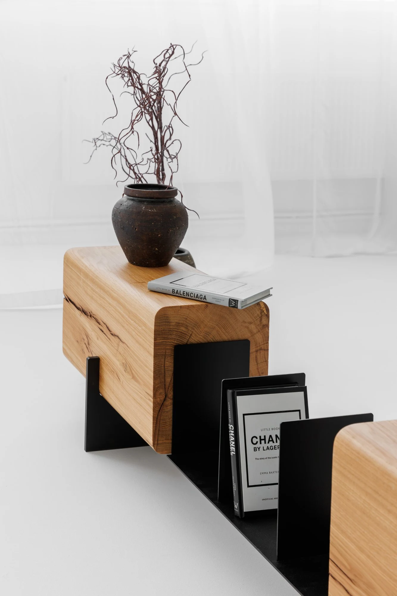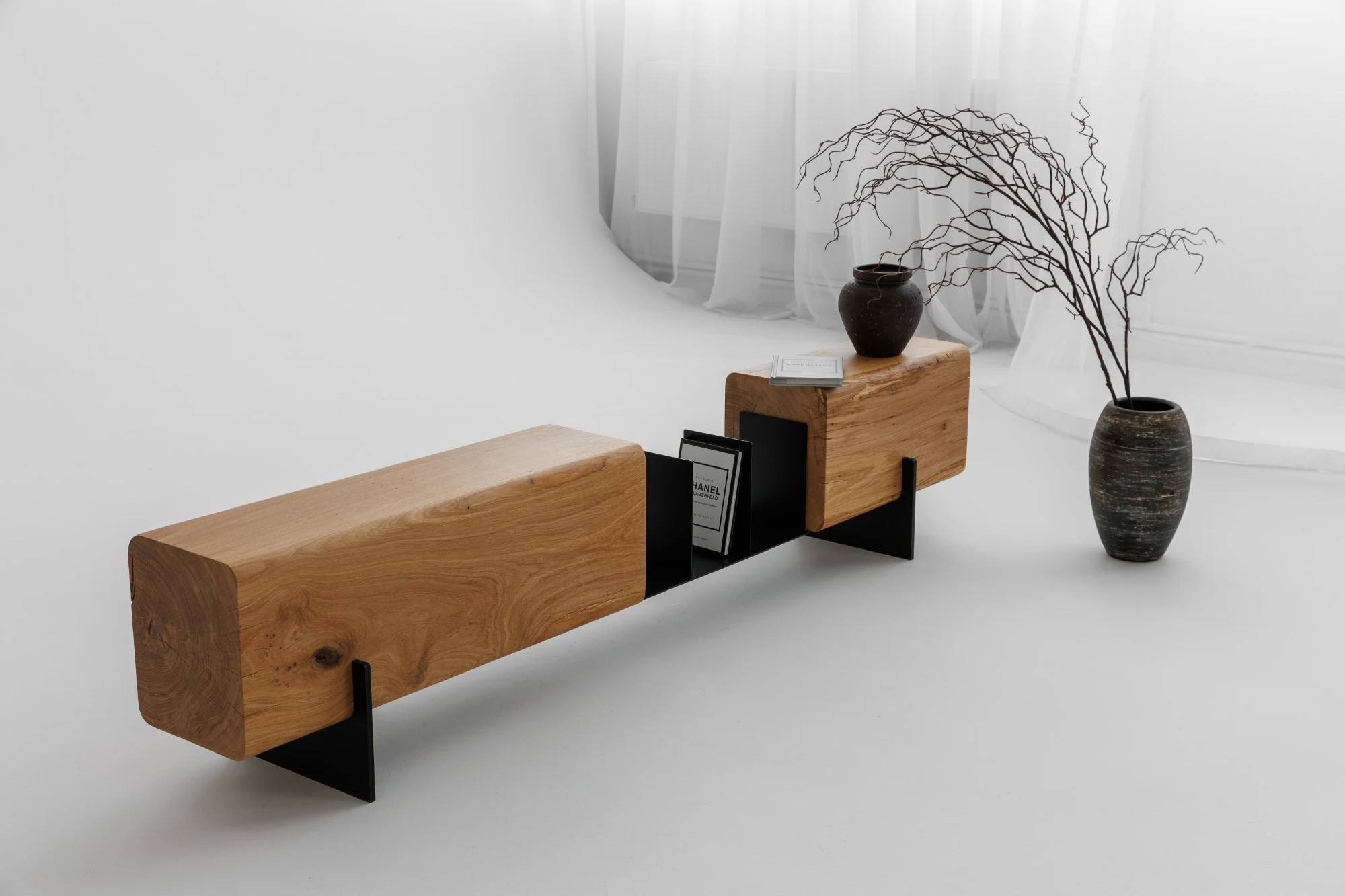 Design și Materiale: Piesa centrală este formată din două blocuri masive de lemn de stejar, al căror farmec natural este pus în valoare prin finisajul ce lasă la vedere fibra, nodurile și textura unică a lemnului. Marginile rotunjite ale grinzilor de stejar contrastează armonios cu liniile curate și suple ale structurii metalice negre. Baza metalică nu doar că oferă o stabilitate impecabilă și o senzație de plutire a lemnului, dar integrează și un spațiu ingenios pentru organizarea cărților sau a revistelor preferate.