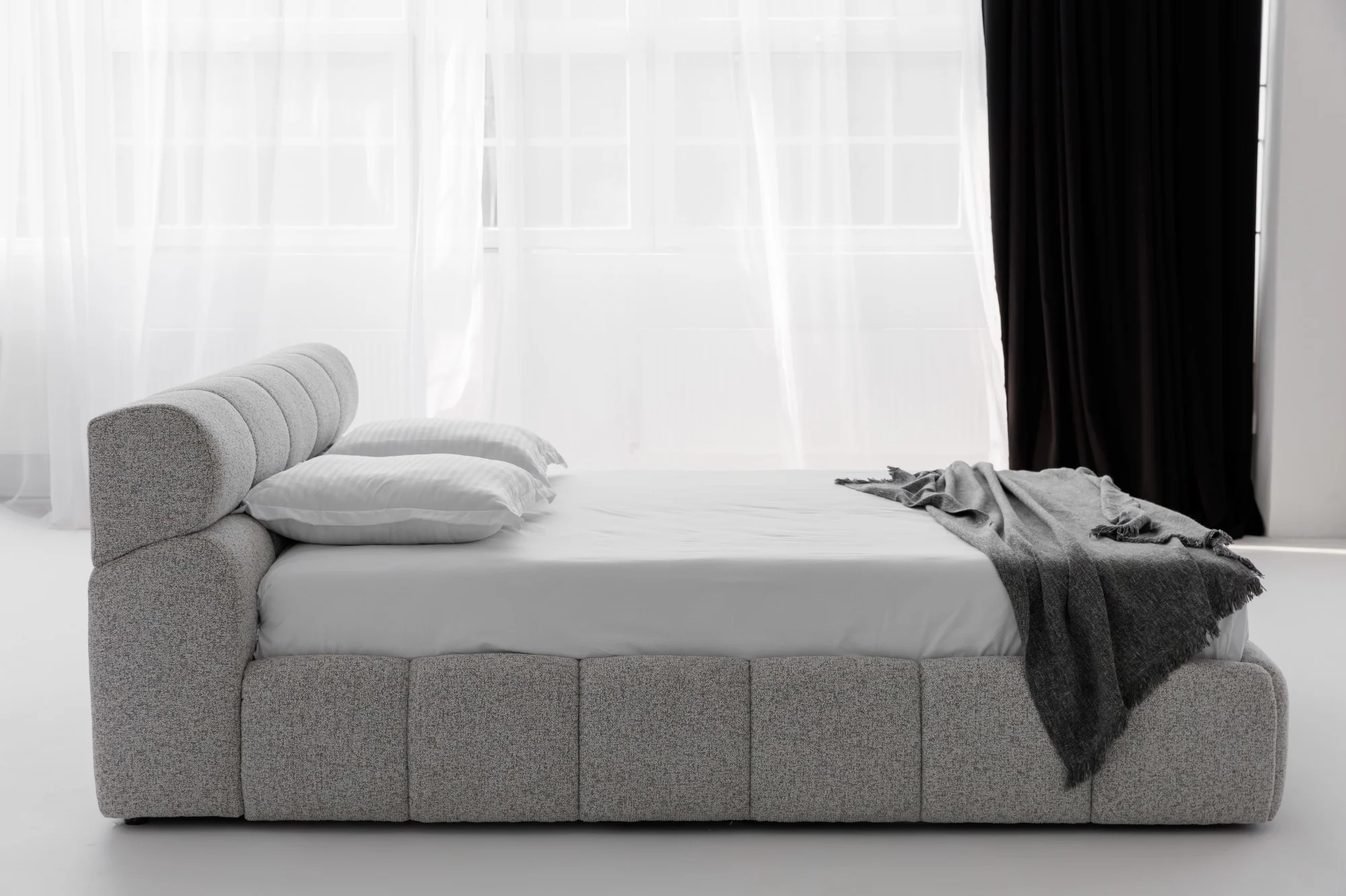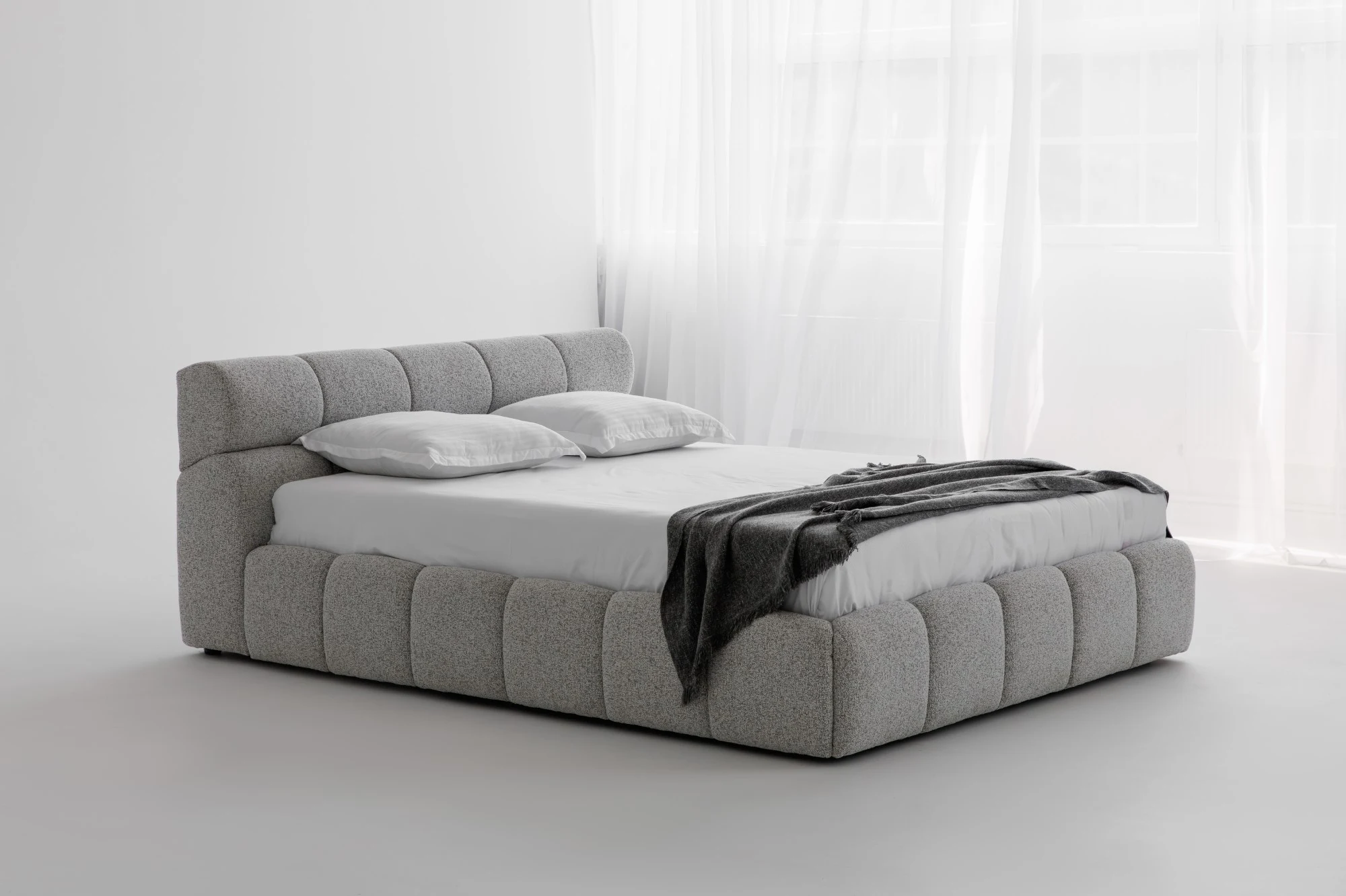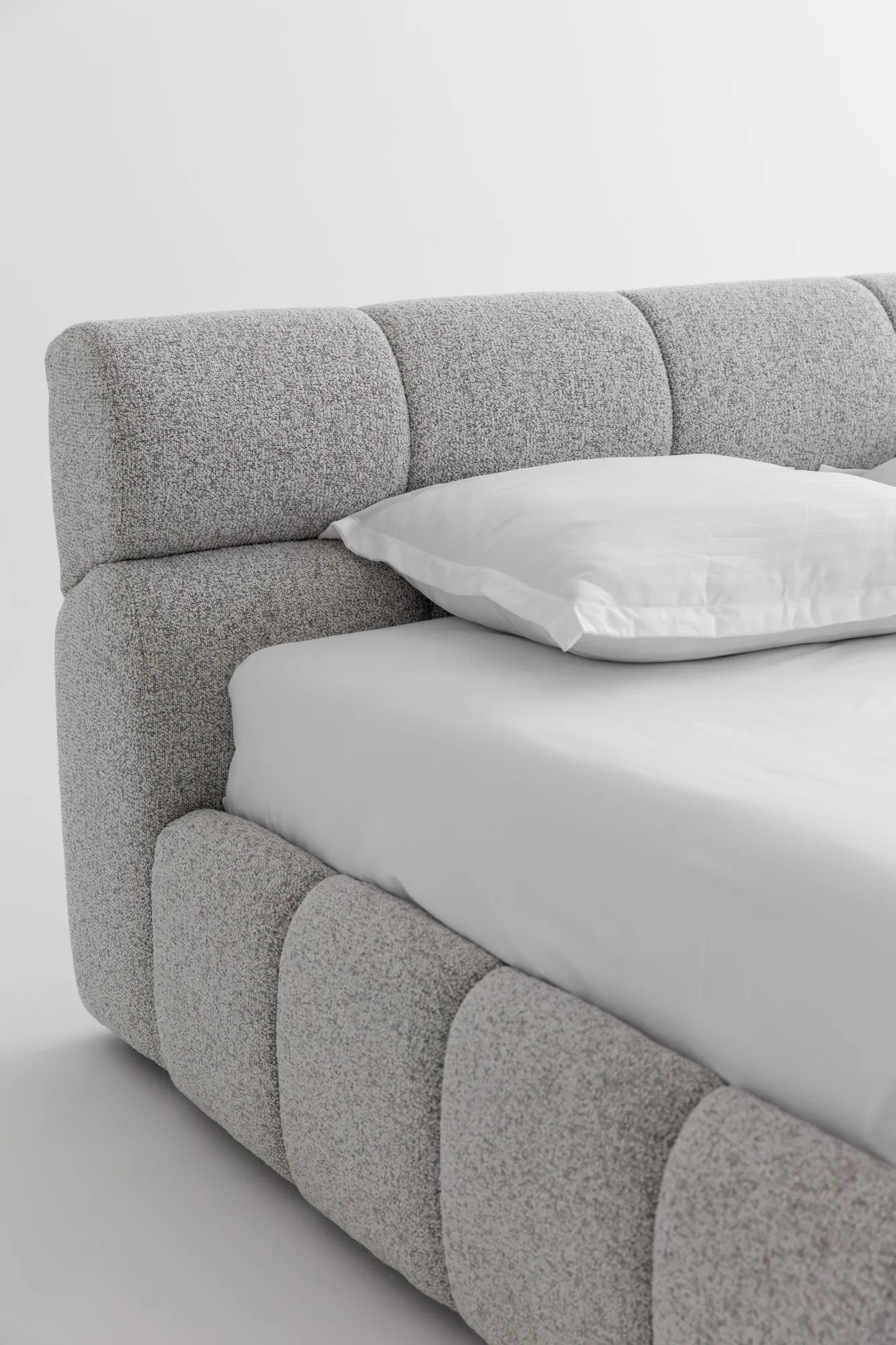 Patul Hamilton impresionează prin designul său distinctiv, caracterizat de panouri verticale capitonate care decorează atât tăblia, cât și cadrul patului. Această estetică adaugă textură și un farmec vizual deosebit. Întreaga piesă este tapițată cu o stofă premium de înaltă calitate, a cărei nuanță neutră de gri se integrează cu ușurință în orice paletă cromatică, aducând un aer de rafinament subtil.