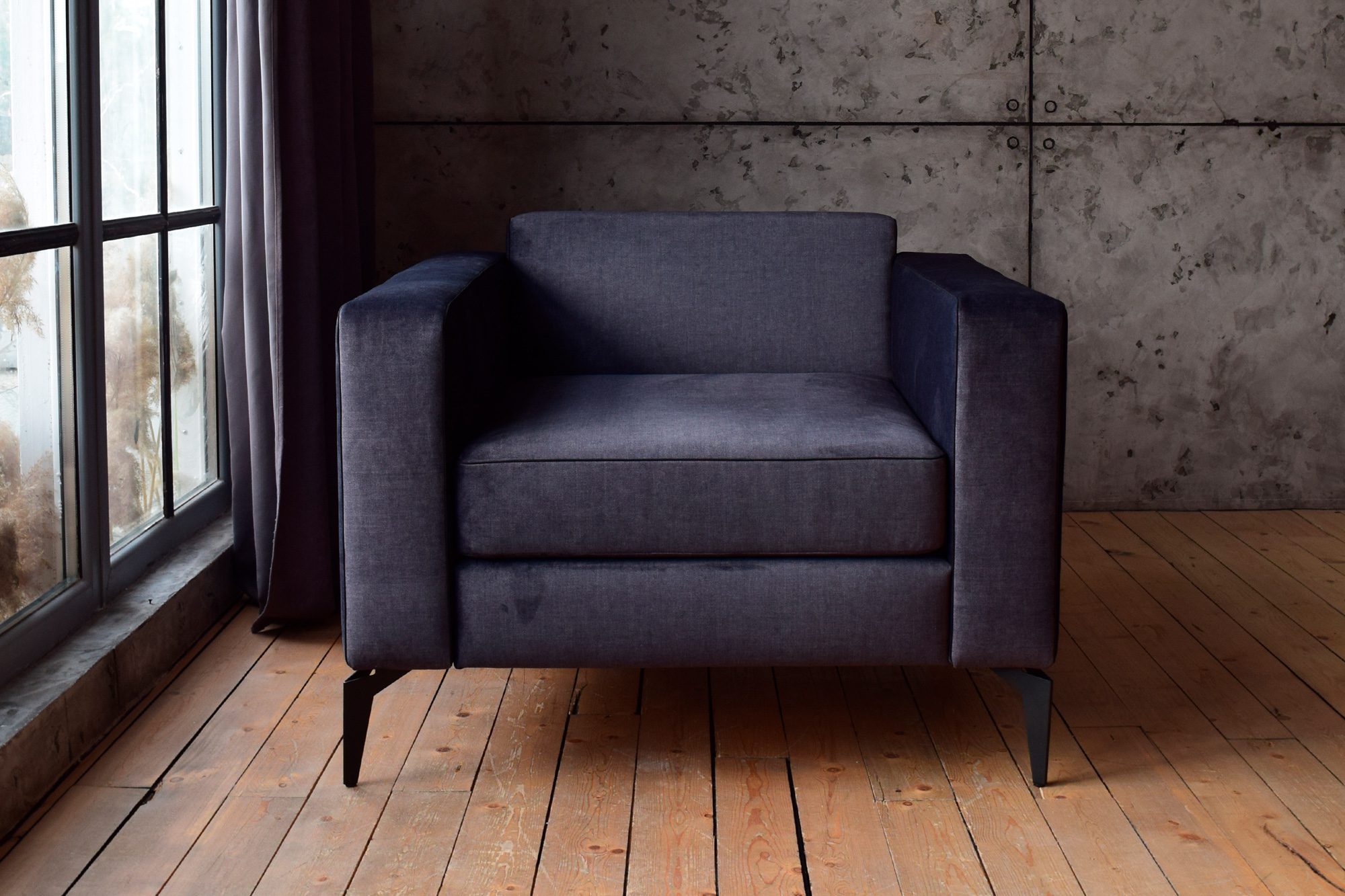 Кресло оснащено устойчивыми металлическими ножками с тонким профилем, которые добавляют легкость и визуально «поднимают» конструкцию, что особенно актуально для интерьеров в стиле лофт, минимализм или скандинавский.